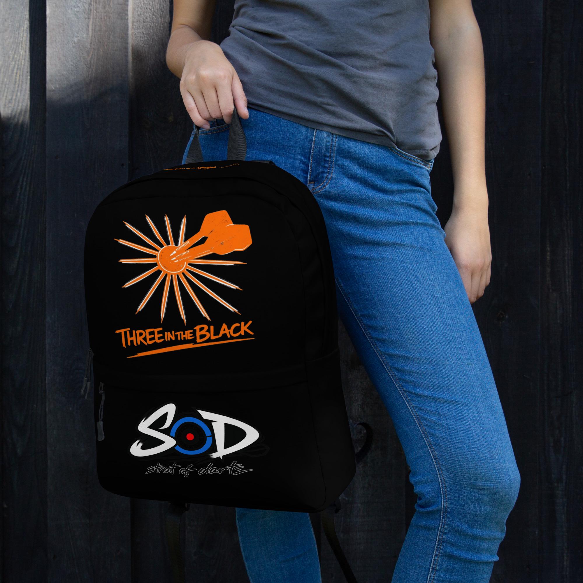 SOD three in the black orange backpack
